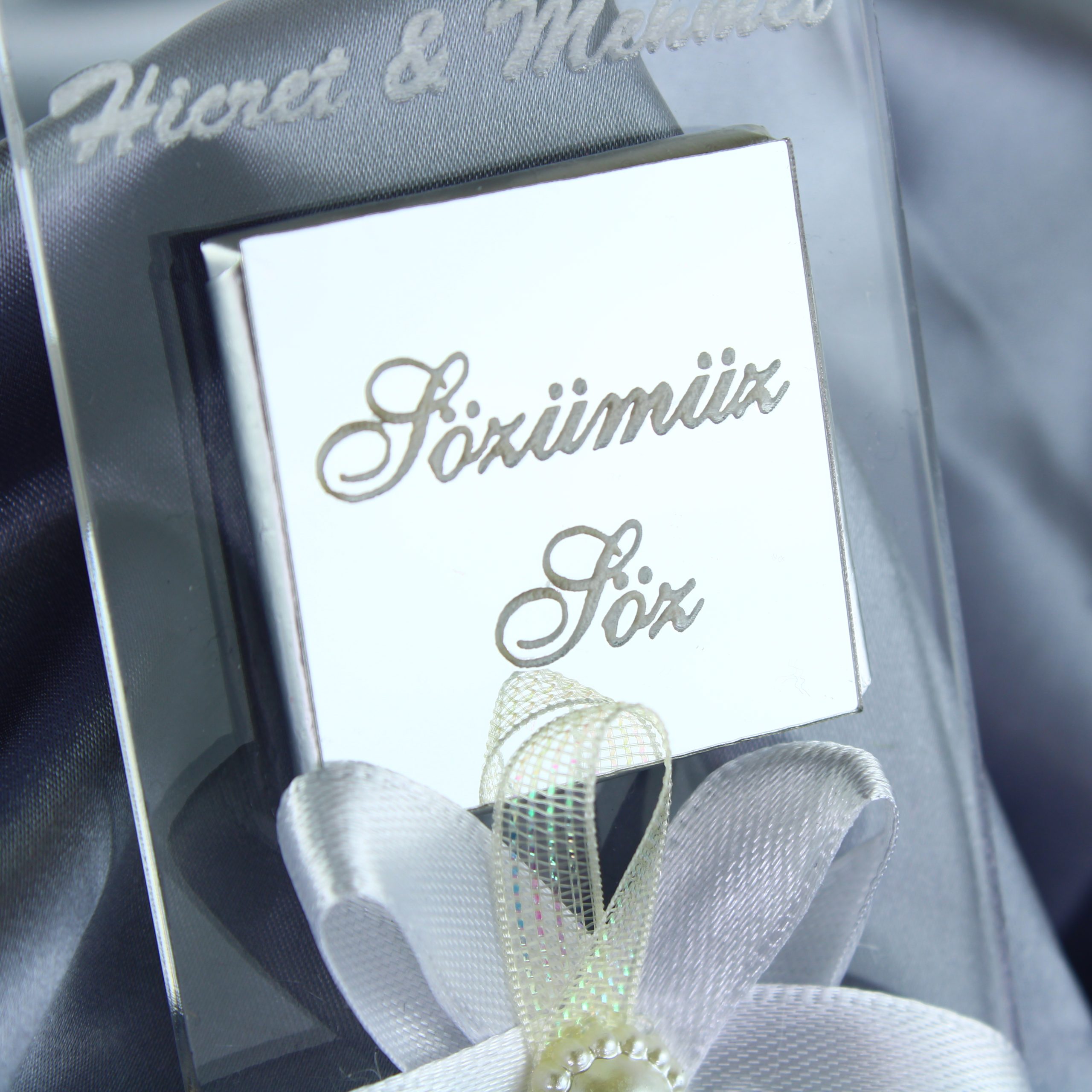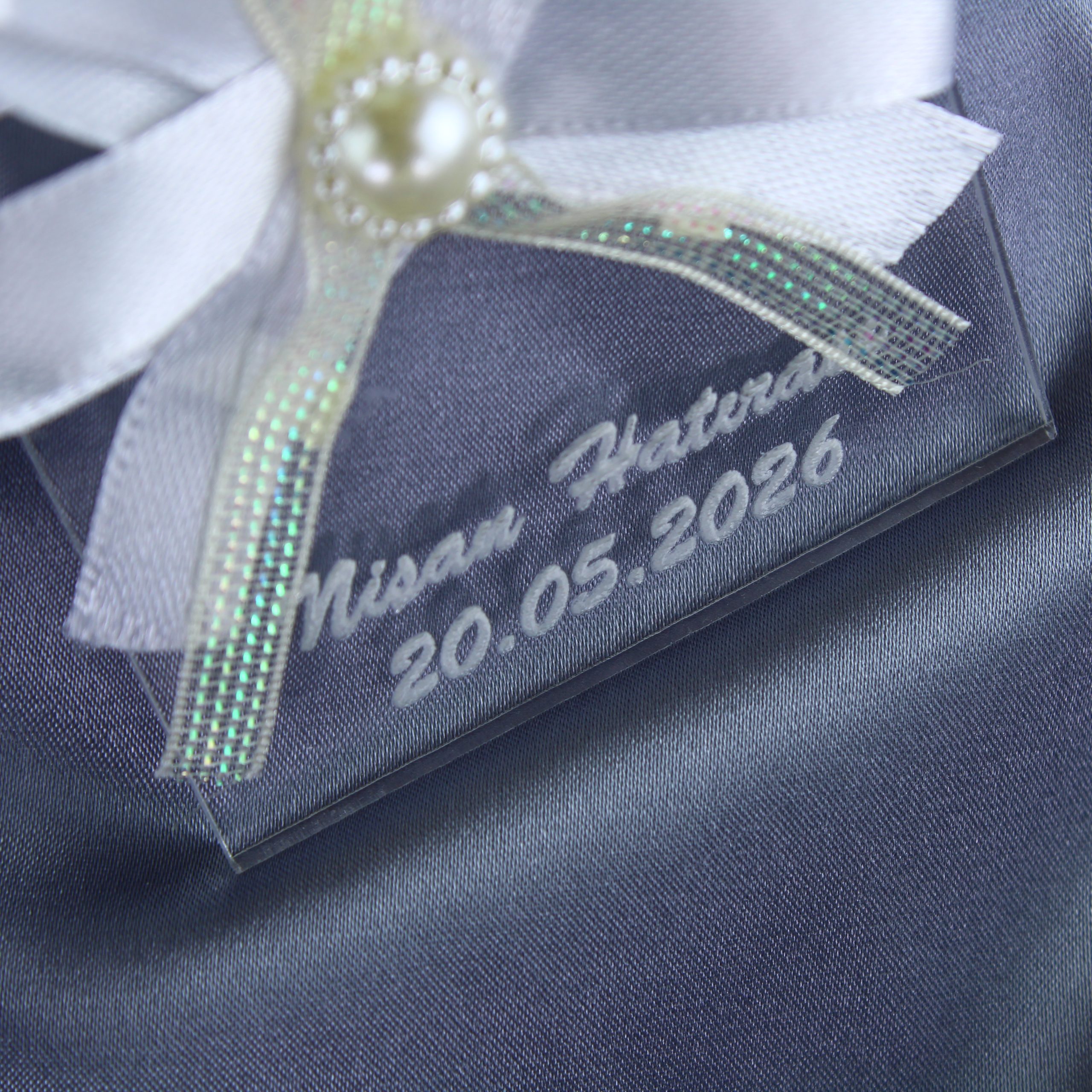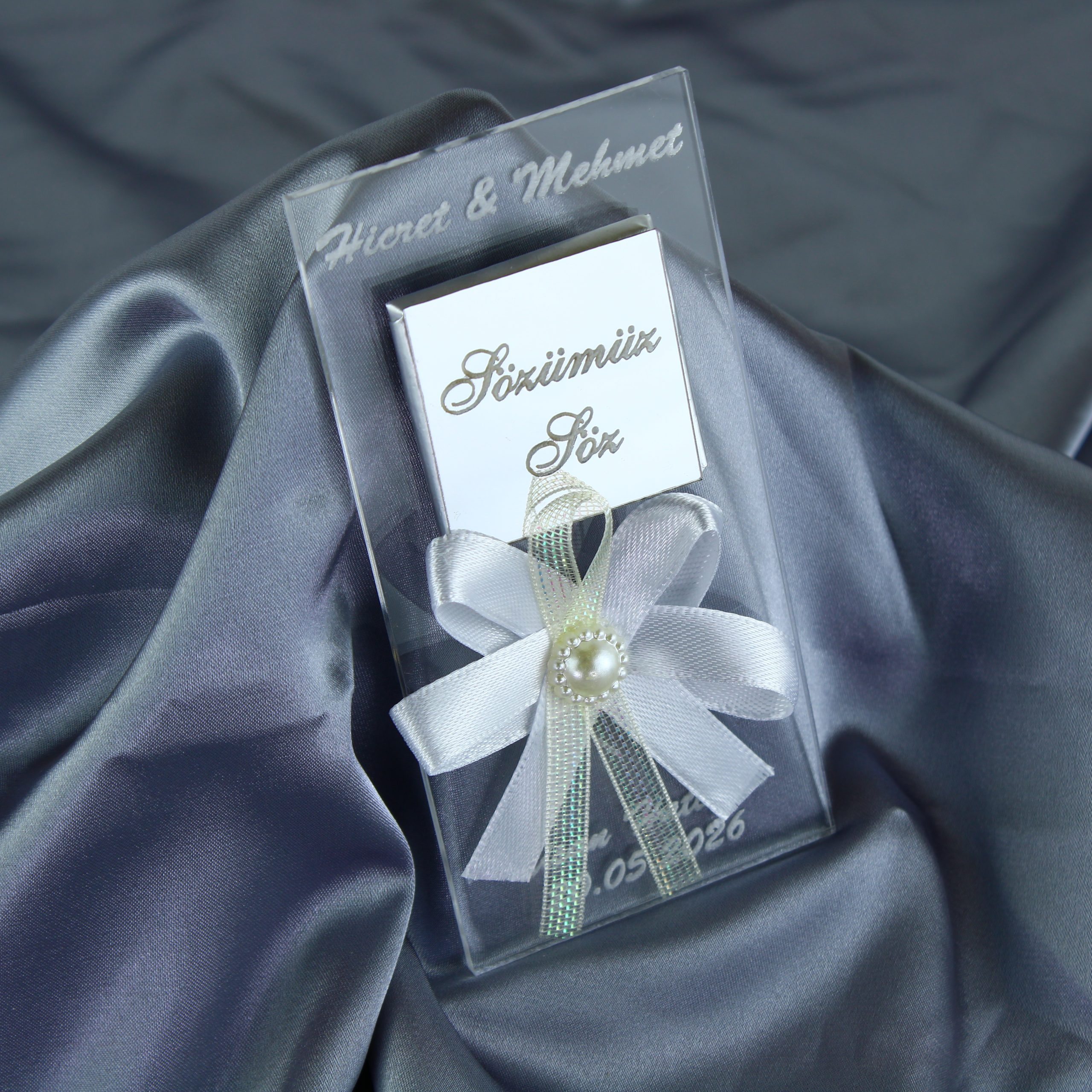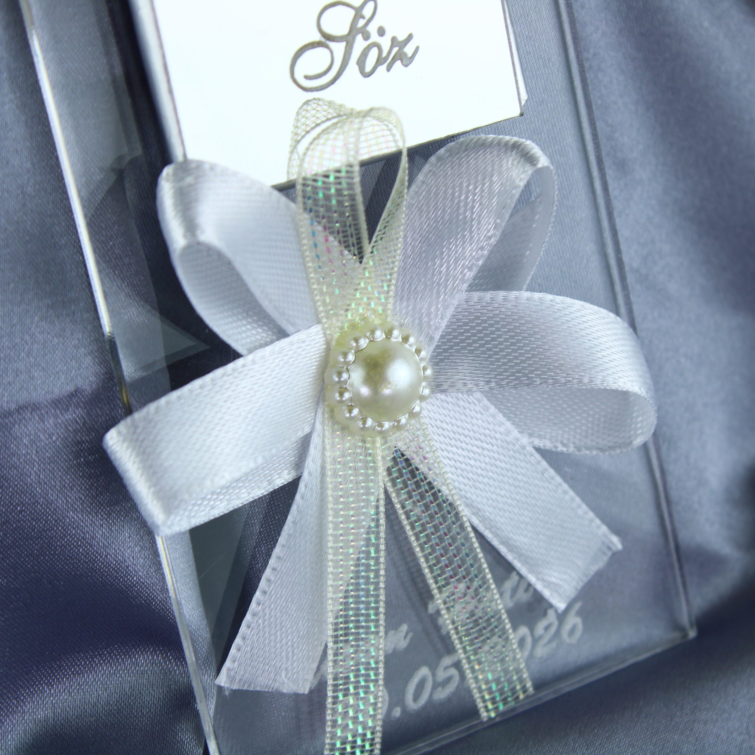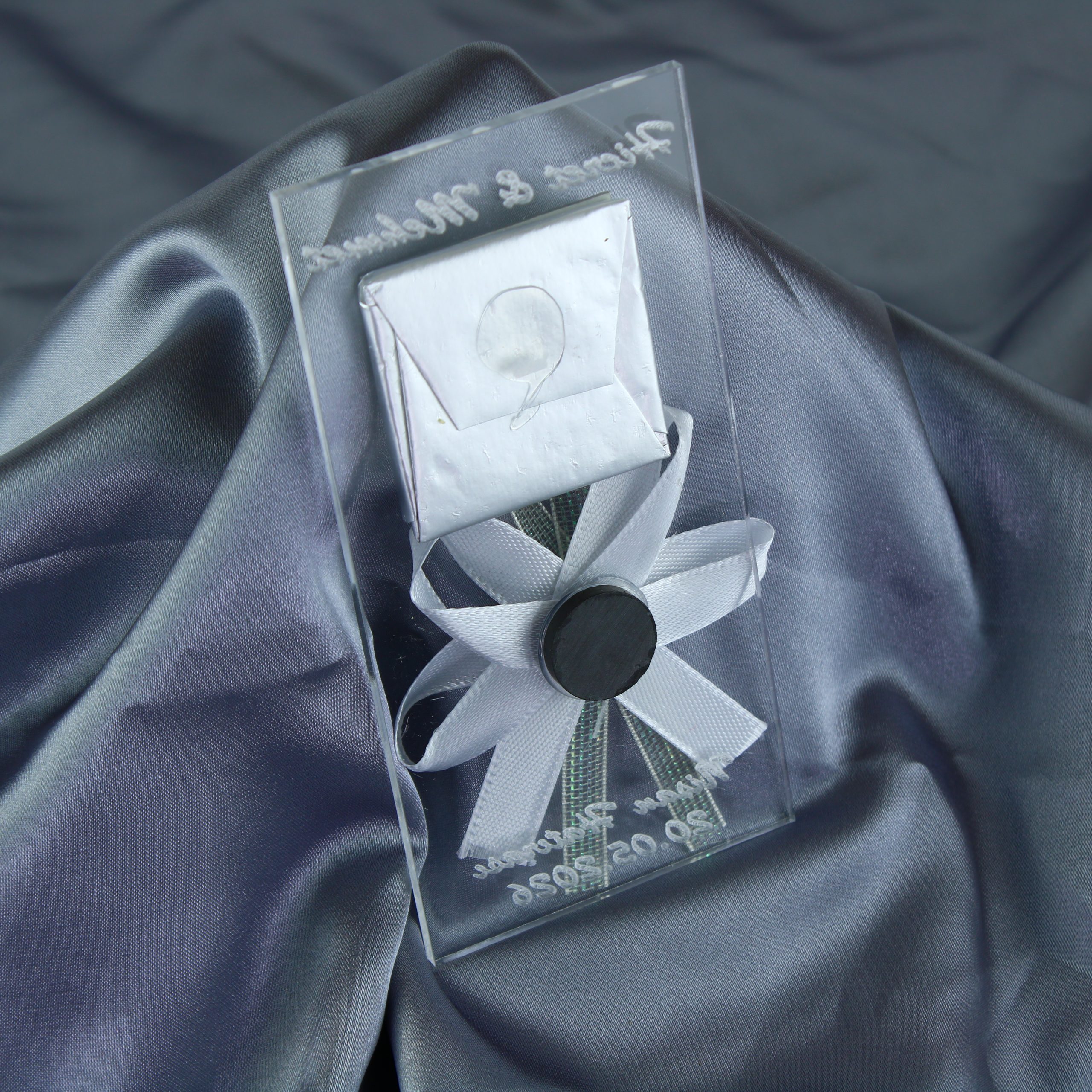 Auf einer 6×12 cm großen transparenten Plexi-Fläche ist eine feine Schokolade angebracht, verziert mit einem Blütenband und edle Perle.