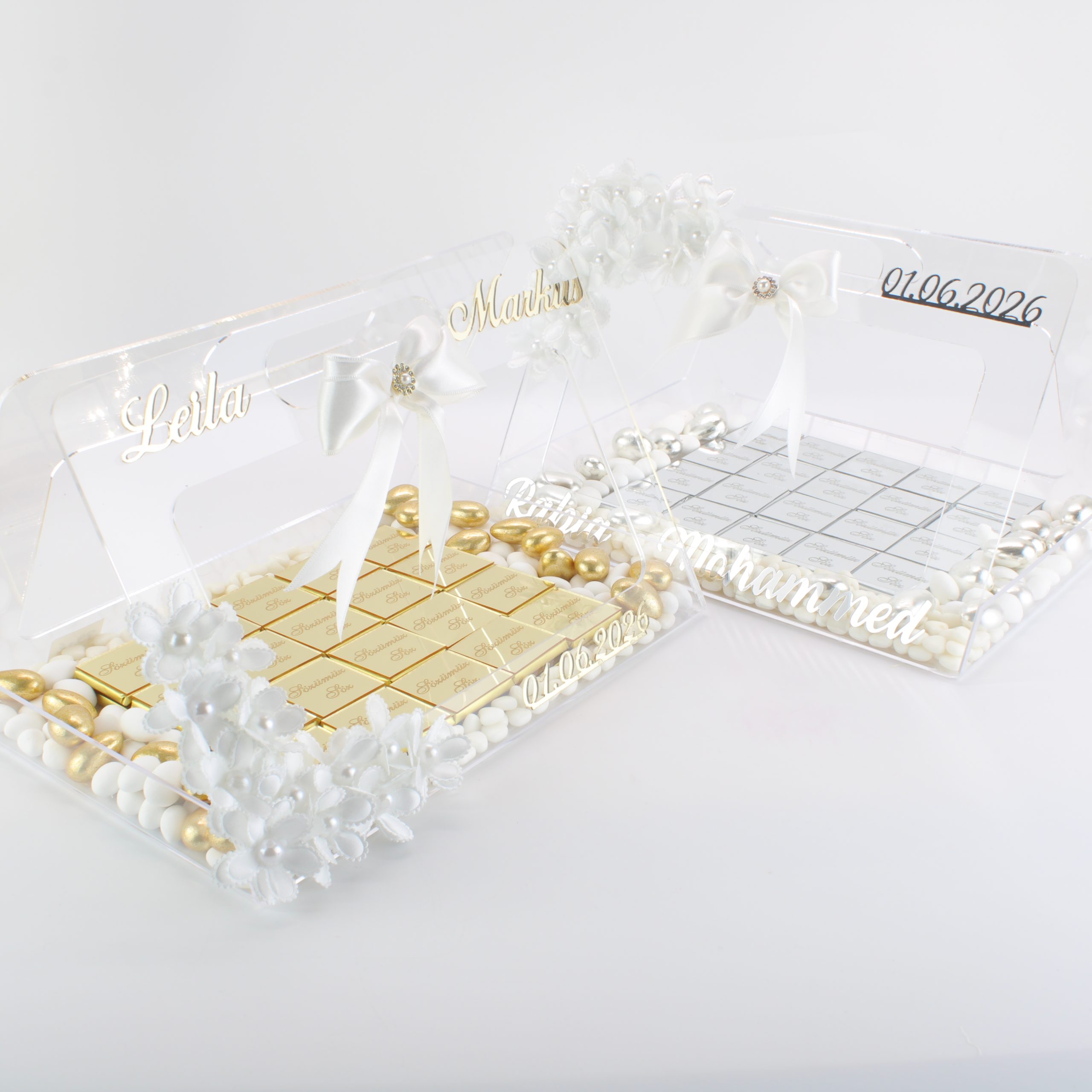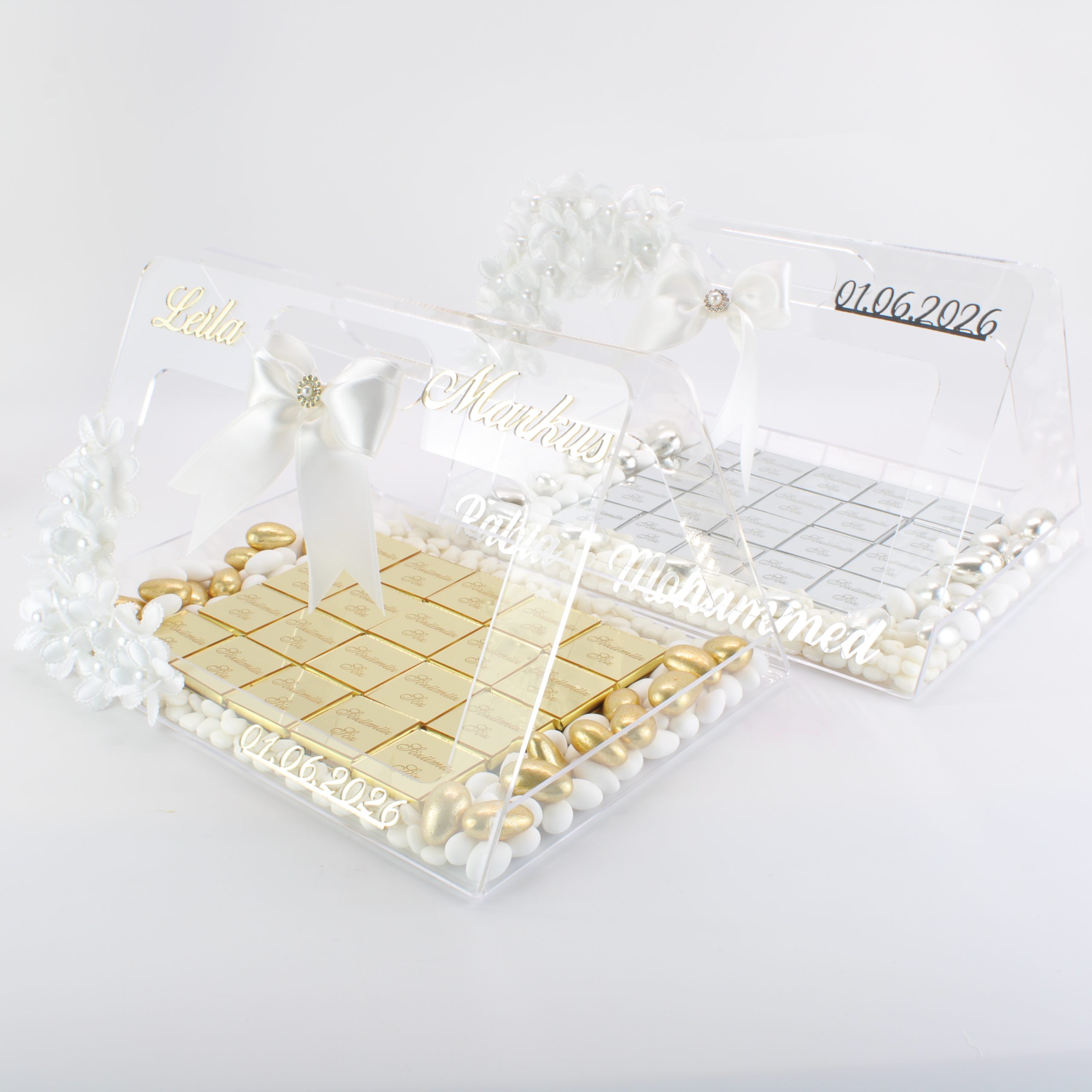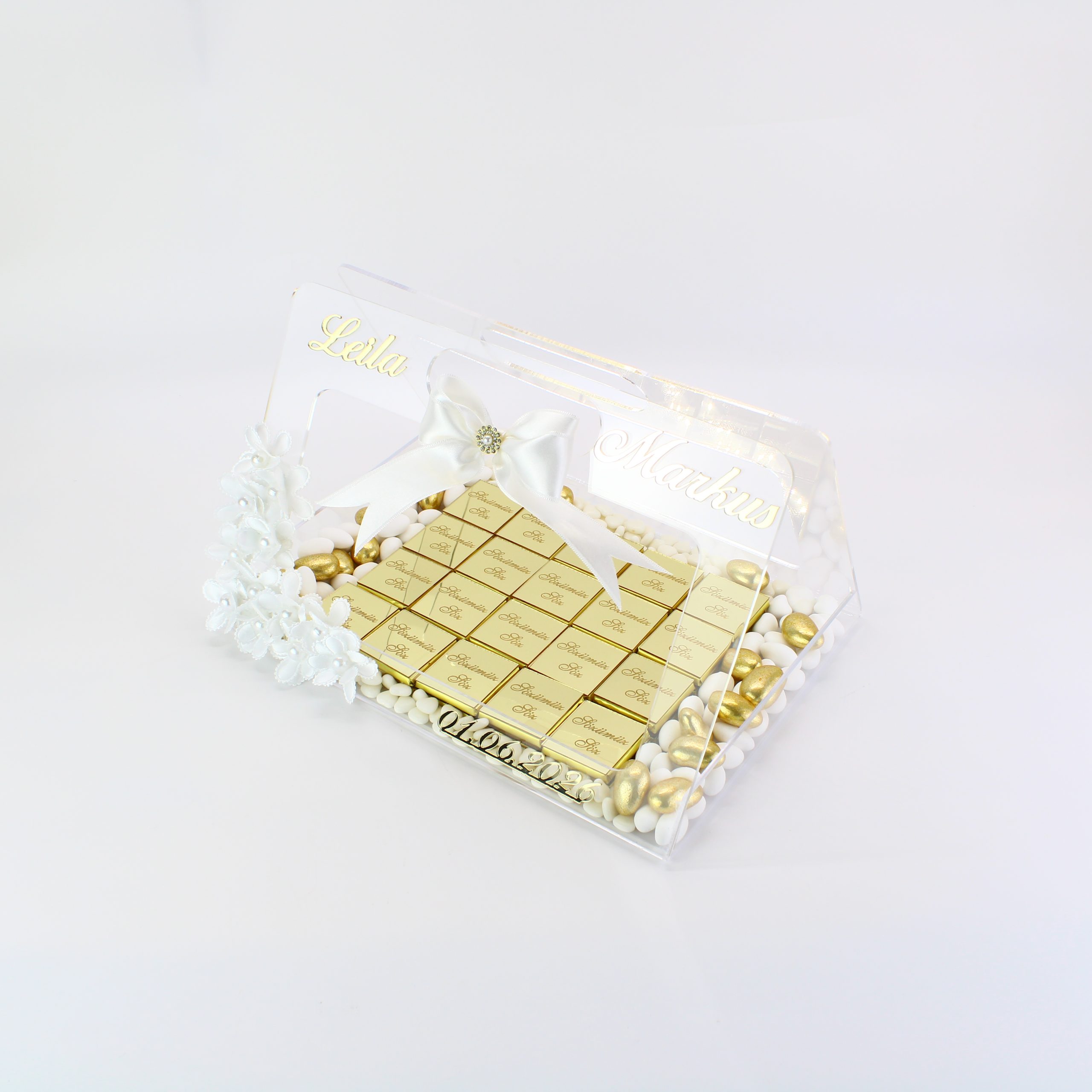 Personalisierte Schokolade | Plexi Schokoladen-Tasche mit Pralinen, Dragees & Süßigkeiten – Prächtig für Verlobung, Hochzeiten & besondere Momente