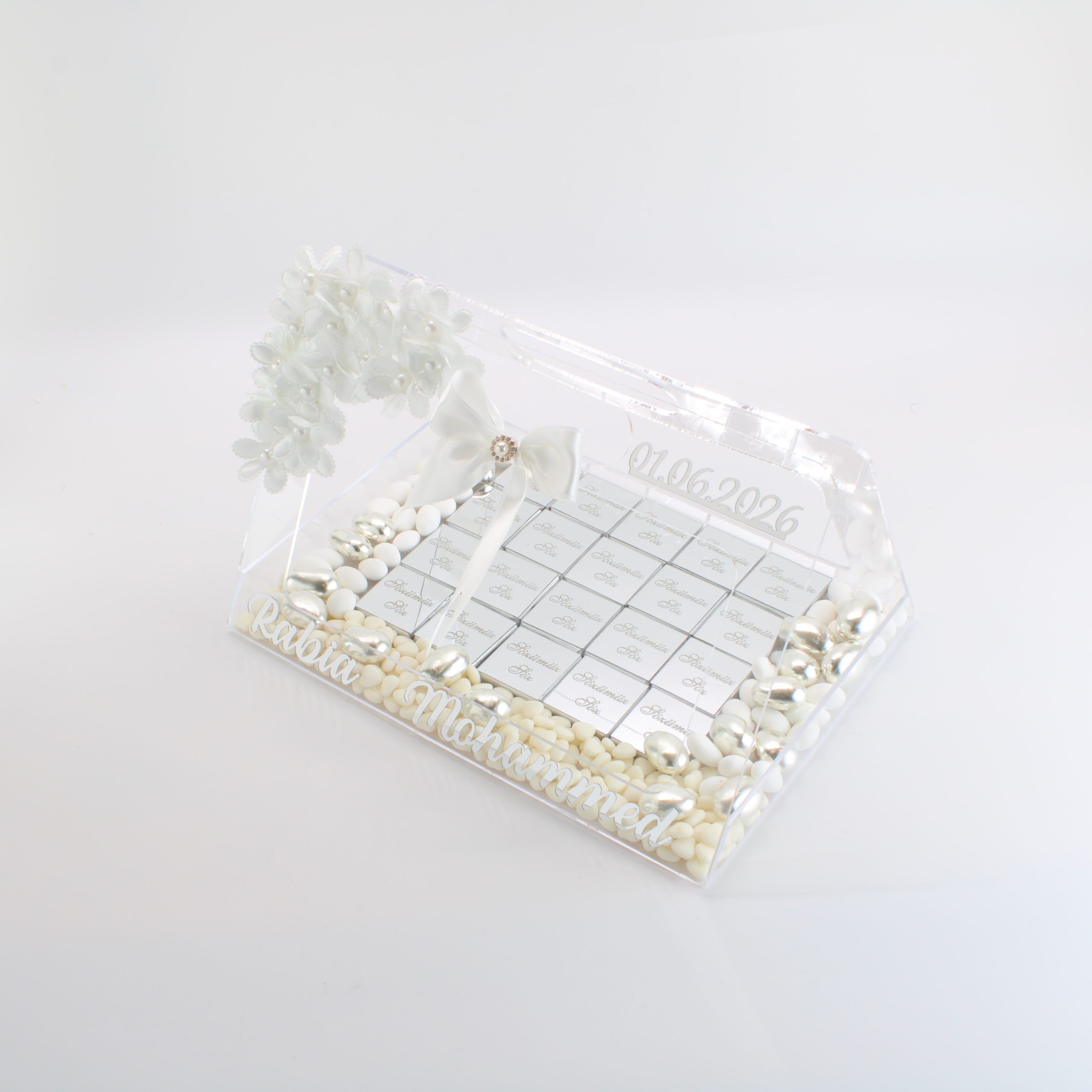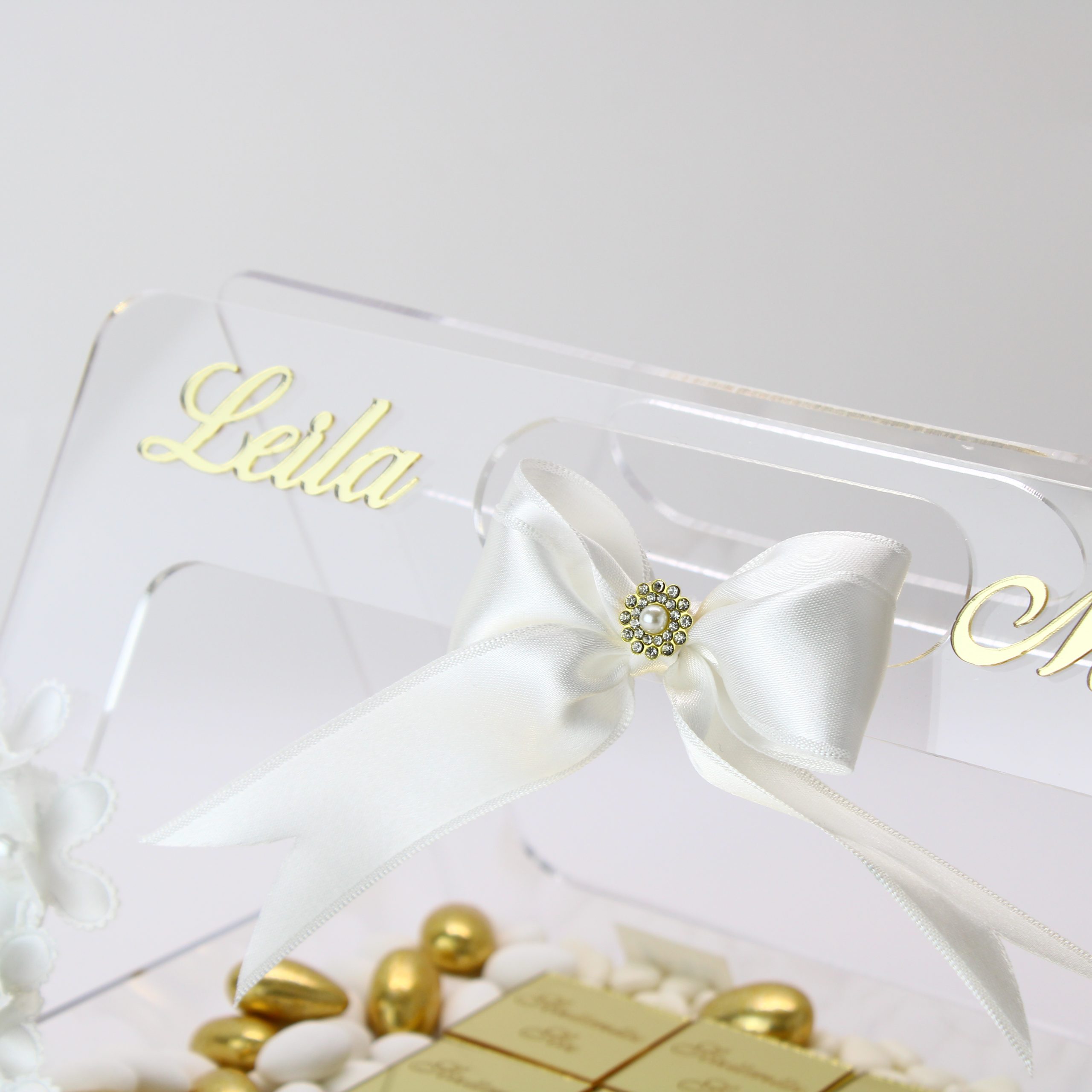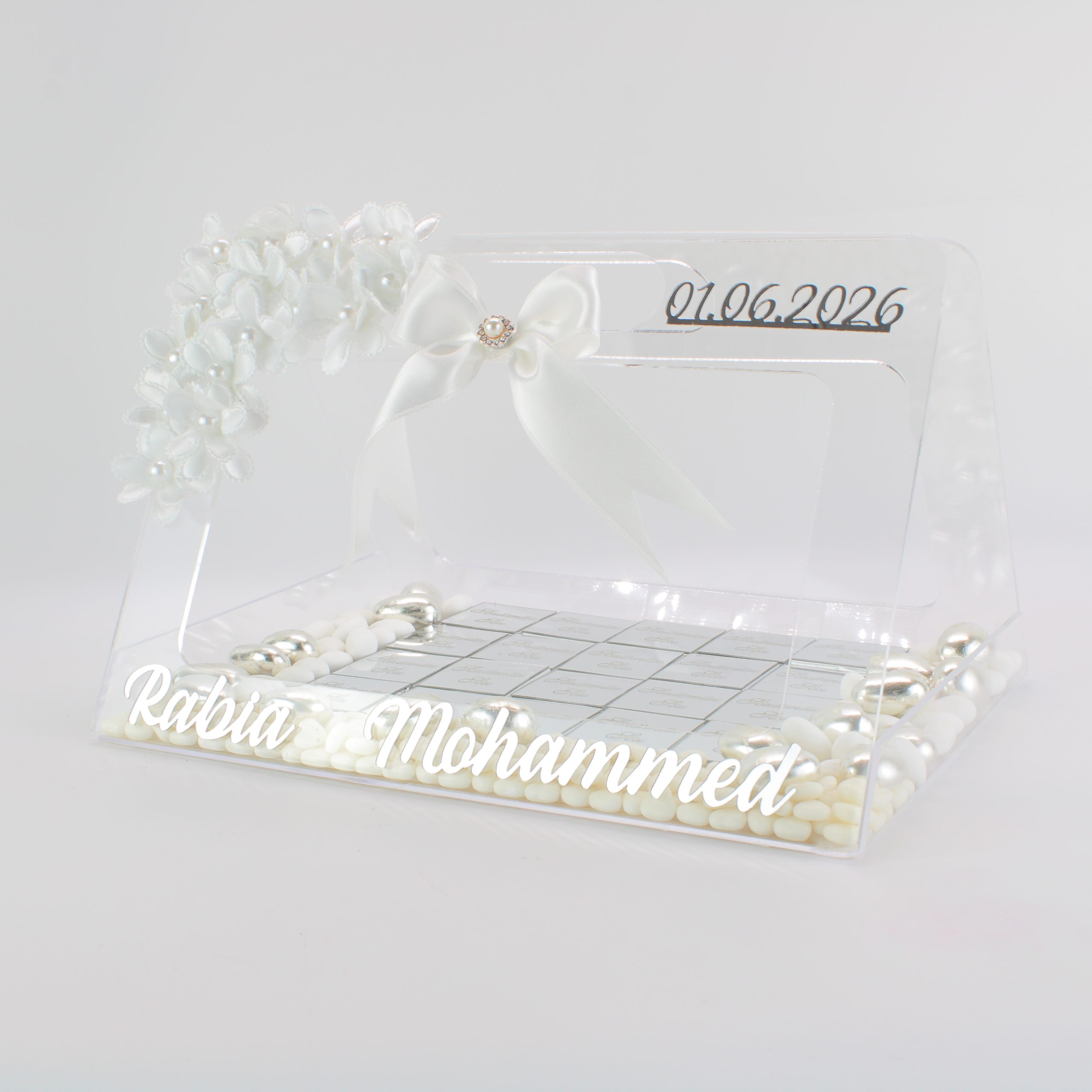 Personalisierte Schokolade | Plexi Schokoladen-Tasche mit Pralinen, Dragees & Süßigkeiten – Prächtig für Verlobung, Hochzeiten & besondere Momente