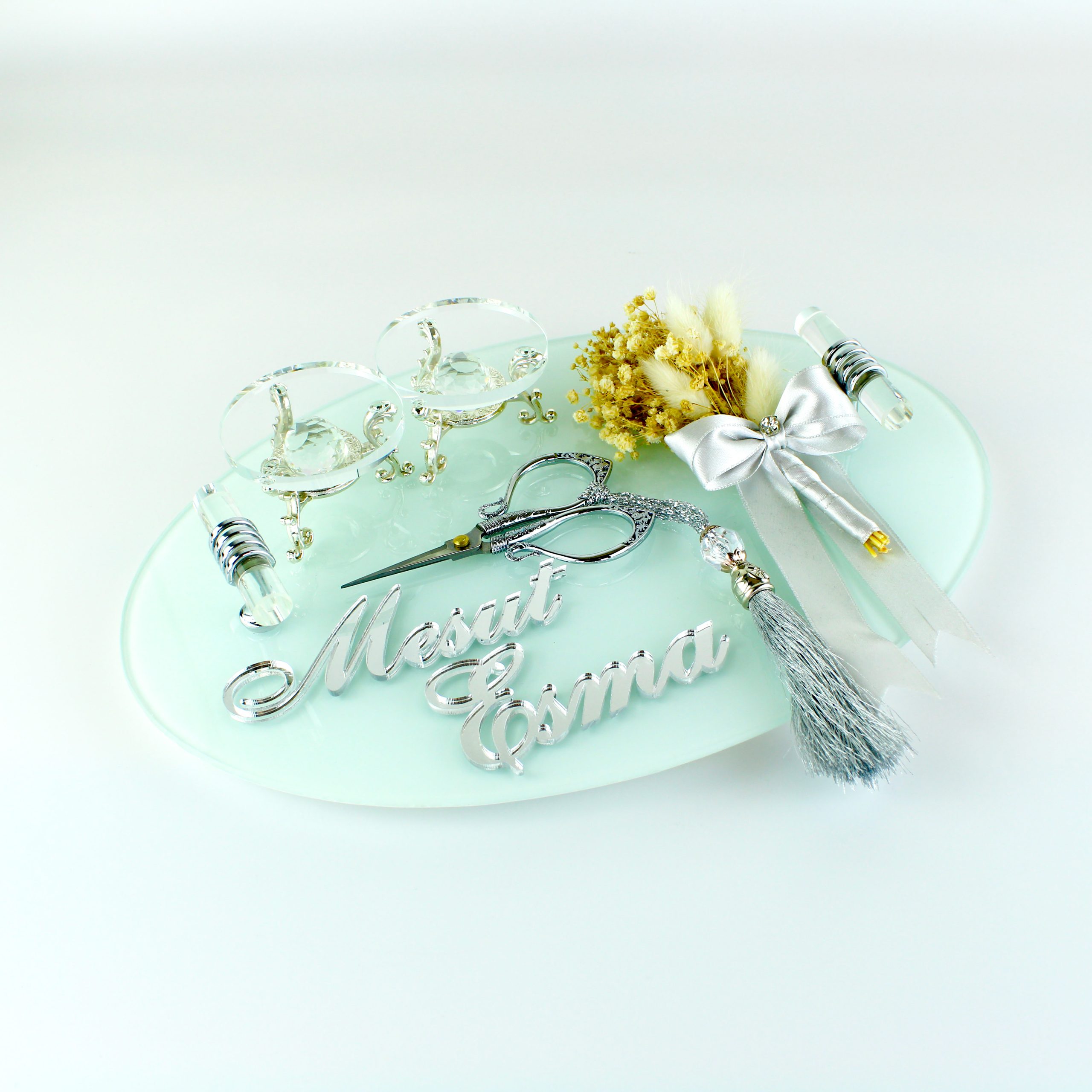 Verlobungstablett | Stilvoll Ringtablett mit Ringhalter, Schere und Blumendekor | Personalisierbar | oval Glasplatte