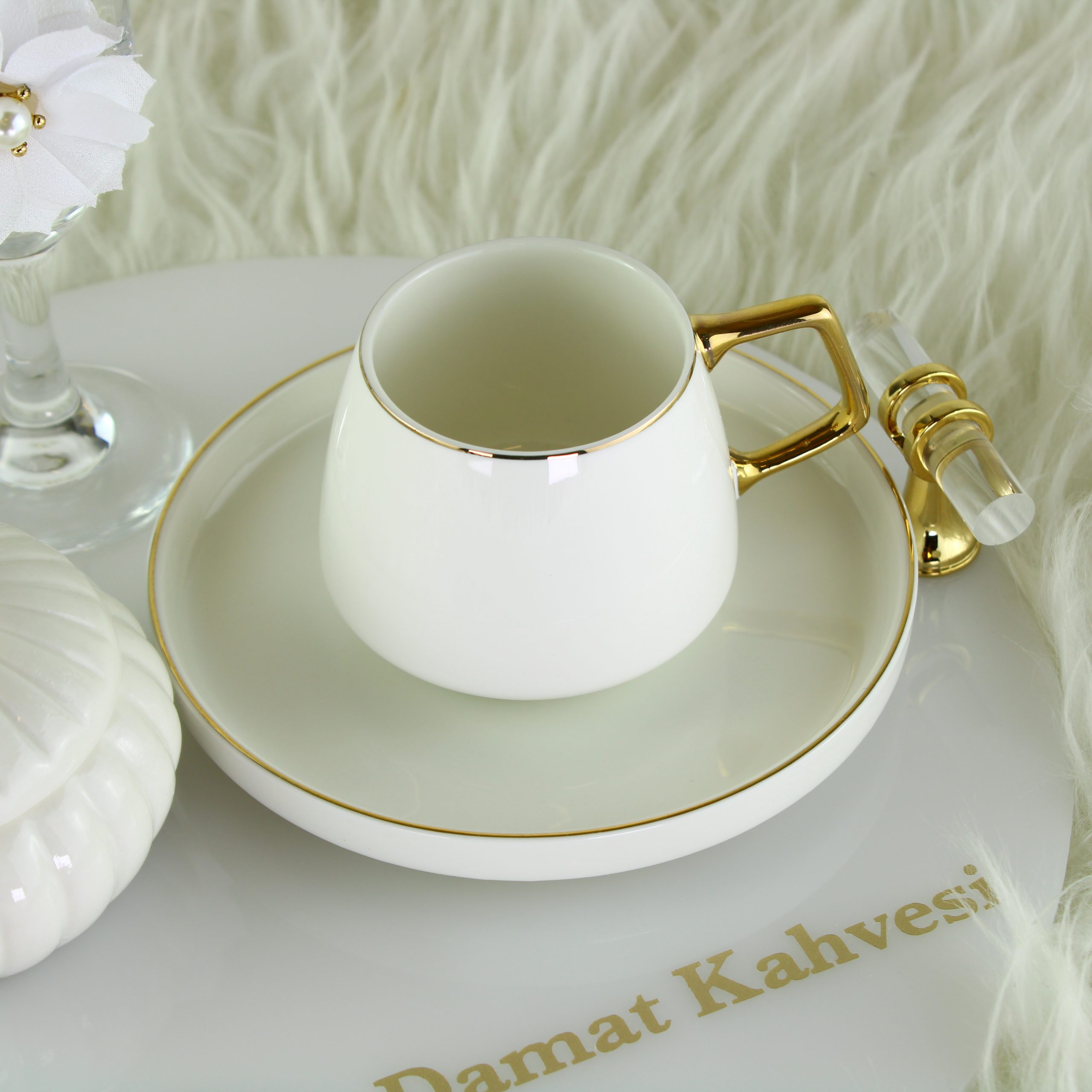 Die goldfarbenen Griffe sowie die Ränder von Tasse, Schale und Glas verleihen dem Set eine luxuriöse Ausstrahlung.